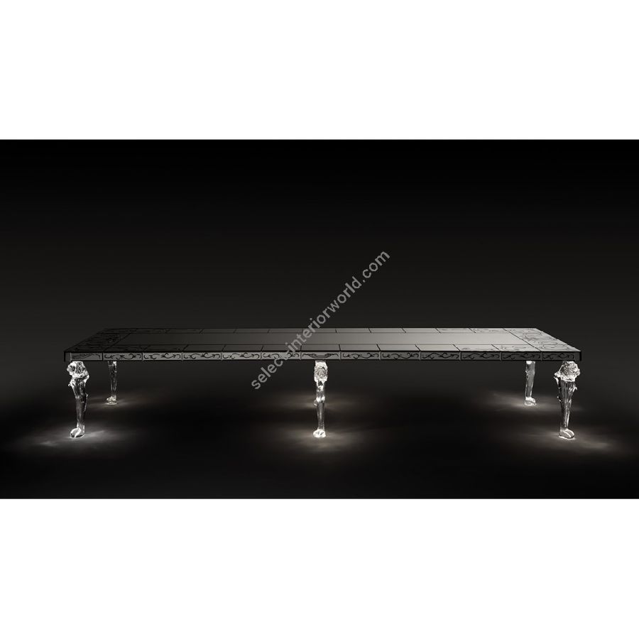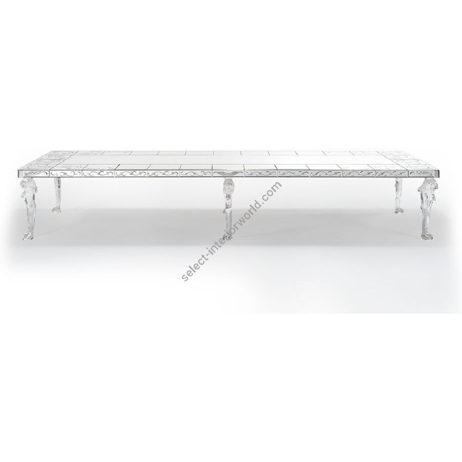 Dining table with base made up of legs in solid transparent Murano glass with Led lighting. Top covered by tiles in extra-clear mirror glass with artistic engravings.