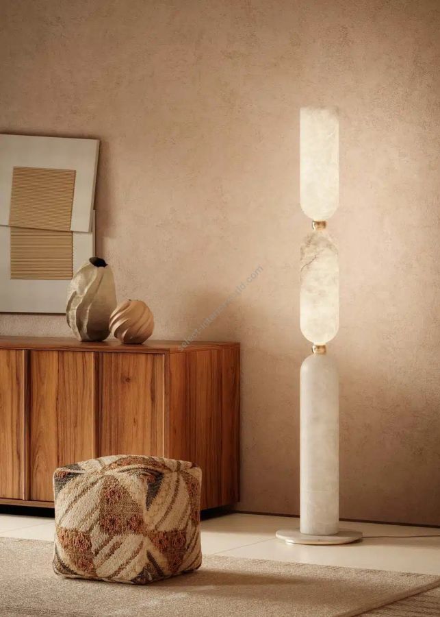 Inspired by the Latin concept of the triad, 'Trias' celebrates the symbolism of the number three, an expression of balance and harmony. In numerology, the number three represents perfection and completeness, and this philosophy is reflected in the lamp's structure, where three alabaster elements interact, creating a balanced and sophisticated composition. The alabaster elements find perfect harmony through a central connection: a metal sphere that unites and enhances the relationship between the forms.