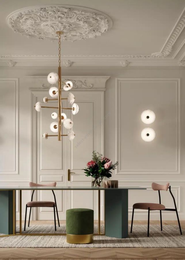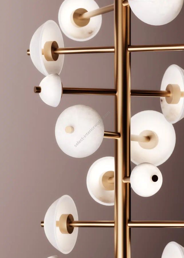 Alabaster domes of varying diameters and tubular elements of varying widths lend dynamism to this exclusive piece, maintaining a perfect balance of style. Named Apollo after the Greek god who pulled the sun chariot, the series draws inspiration from this peculiarity; a metal structure supports a series of luminescent hemispheres.