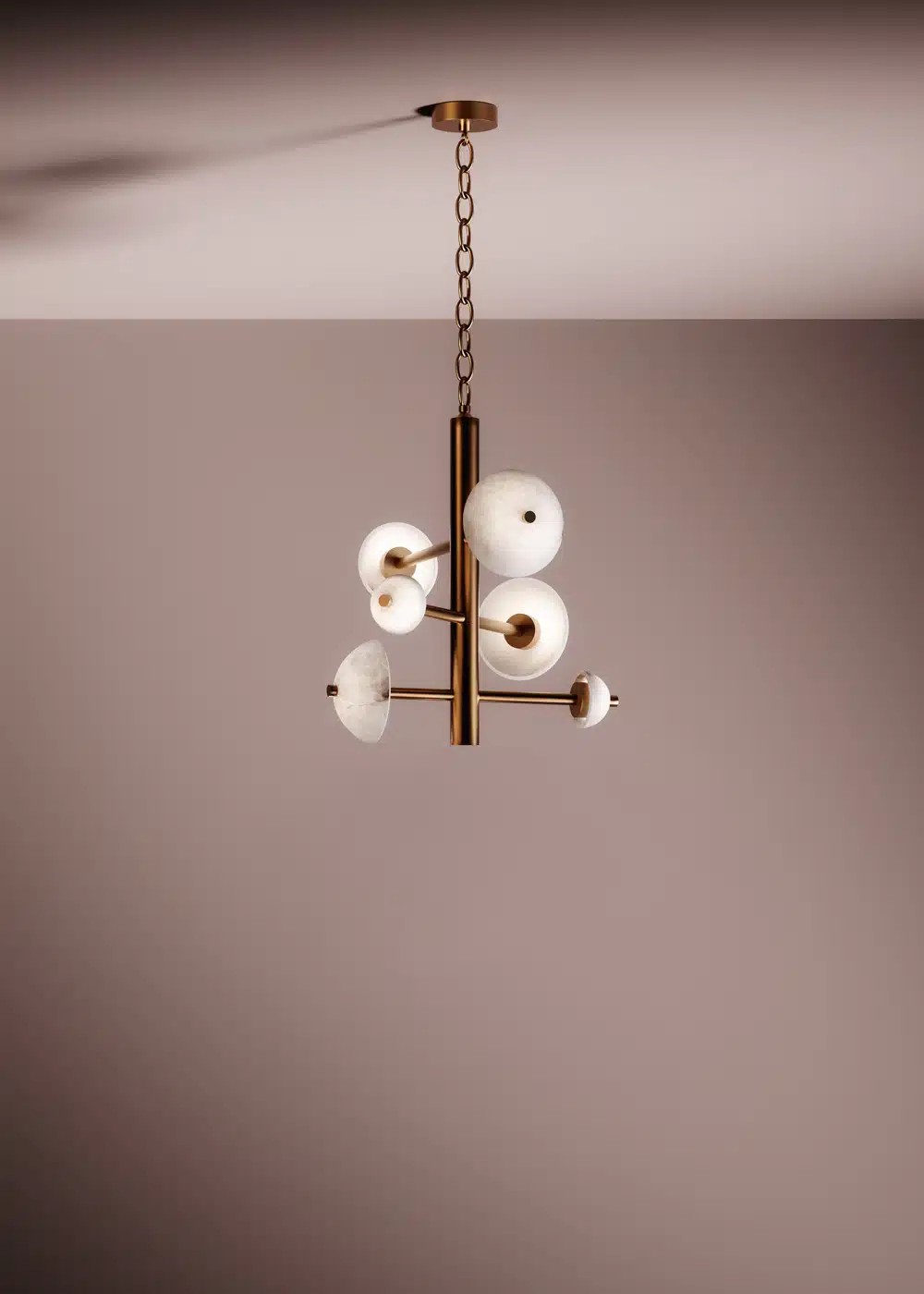 Alabaster domes of varying diameters and tubular elements of varying widths lend dynamism to this exclusive piece, maintaining a perfect balance of style. Named Apollo after the Greek god who pulled the sun chariot, the series draws inspiration from this peculiarity; a metal structure supports a series of luminescent hemispheres.