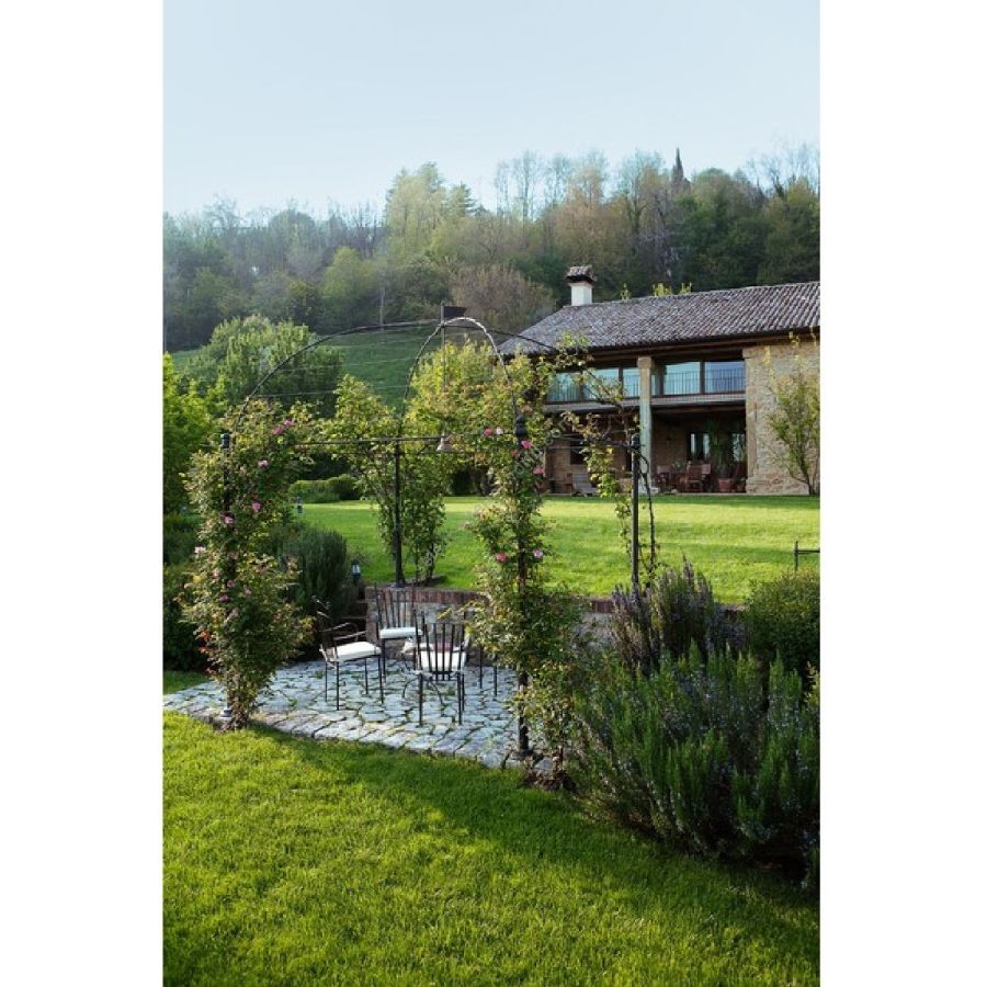 The construction consists of aged brass poles connected by aged brass tubing. The lighting appliance is in aged copper. It comes with all the accessories needed for a simple lawn anchoring, although it can be customized with wood, granite or bricks. The structure can be covered with canopy, climbing plants or Indian drapes. Horizontal dimensions can be adapted to existing or custom designed spaces. Item provided with lighting fixture including bulb.