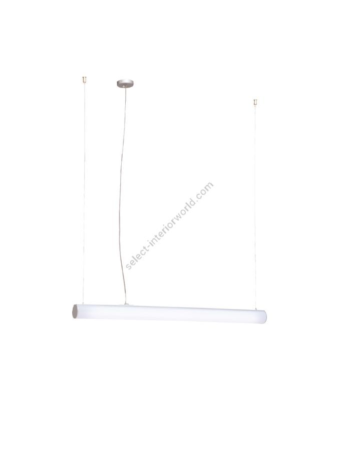 The collection has two models, which, in reality, are three in practice: one that serves as both a ceiling lamp and as a sconce, and the other is a pendant. The cylindrical shade has a diameter of 8cm, is made of opal polycarbonate and is available in three lengths: 60, 90 and 120cm. The structure is made of textured painted iron in two finishes to choose: white and silver. The light source is an integrated LED strip 230V 2700K CRI>80 dimmable by TRIAC, with power and luminous performance depending on the length of the lamp: 14W 1350lm for the length of 60cm; 22W 2160lm for 90cm and 30,8W 2970lm for the one of 120cm.