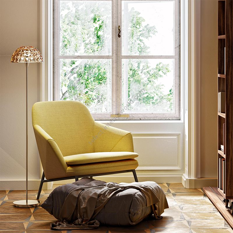 The structure is available in two finishes: shiny chrome and matt gold. It uses lamp holders E14 in table and floor lamps, and G9 in hanging, ceiling and wall. These sockets easily allow the application both of an incandescent or an LED bulb, at user’s choice. Its sturdy glass, pressed and faceted, is made in Bohemia –indeed, it is a glass with denomination of origin- and is presented in three colors: transparent, amber and turquoise.