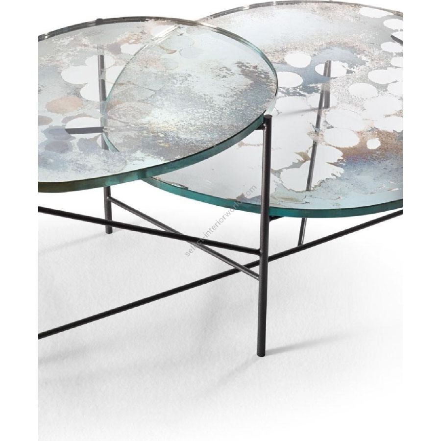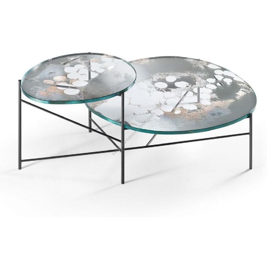 Metal structure with black matte finish. Two different oval-shaped top made of glass with medium antique mirrored finish and partially transparent according to a spotted artistic motif.