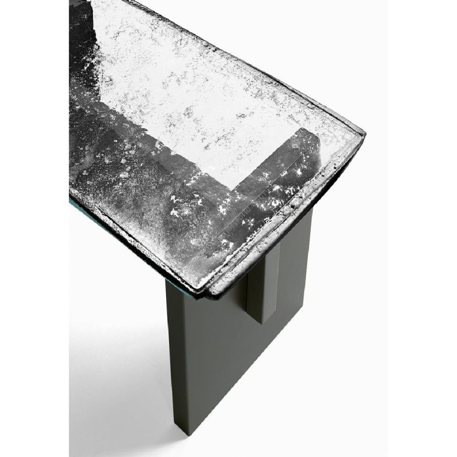 The top is made of two layers of mirrored baked glass with uneven borders. Matte black lacquered with a multilayer wooden structure.