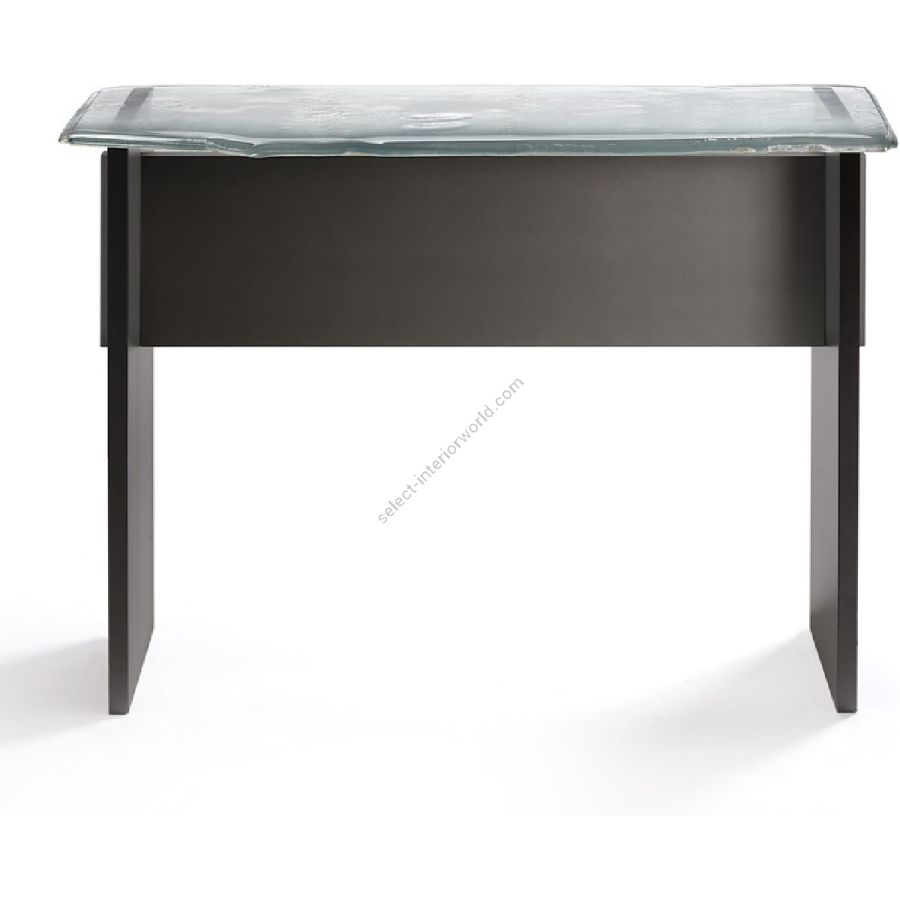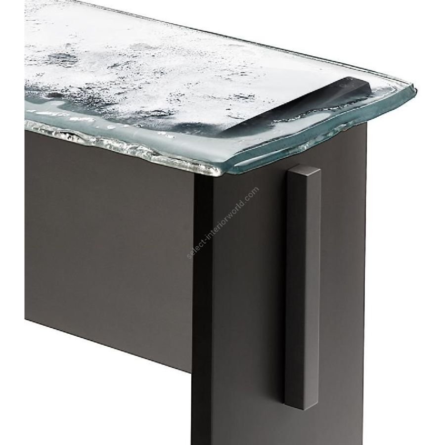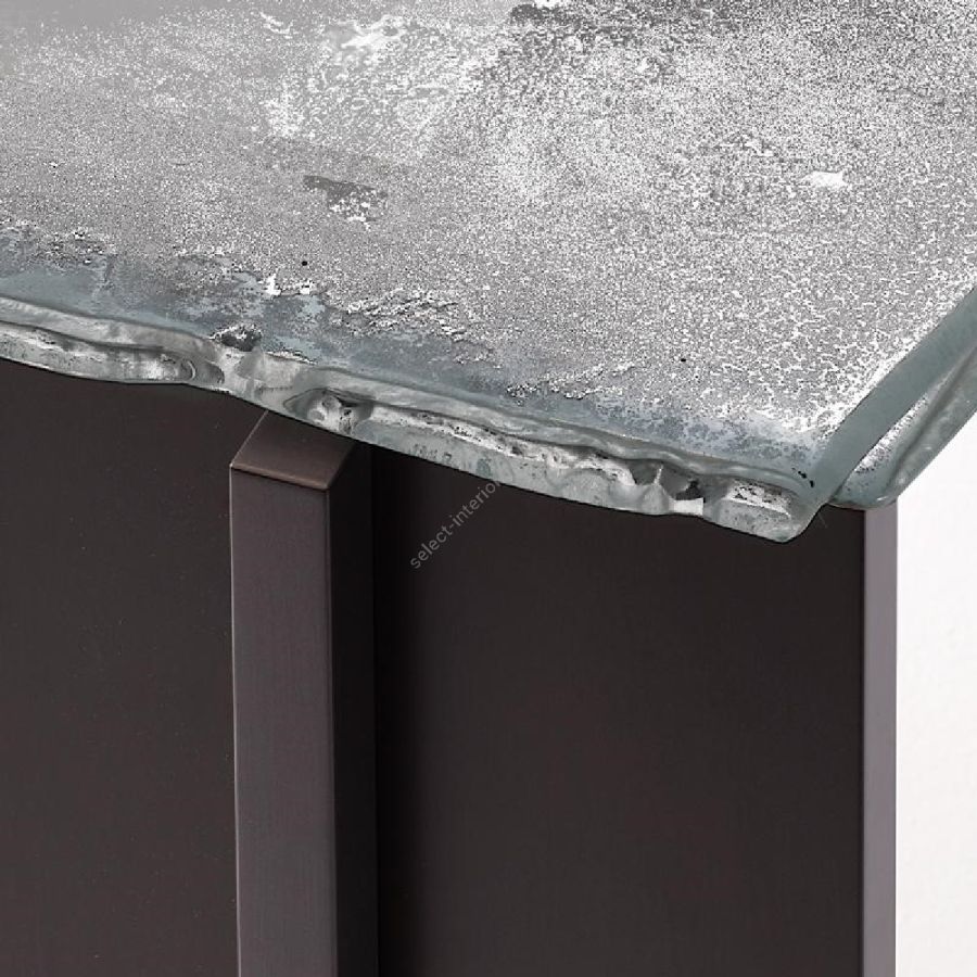 The top is made of two layers of mirrored baked glass with uneven borders. Matte black lacquered with a multilayer wooden structure.