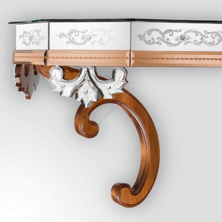 Structure made of wood with walnut coloured finish. Top, front and lower decoration made of bevelled glass with clear mirrored finish and decorated with handmade engravings.