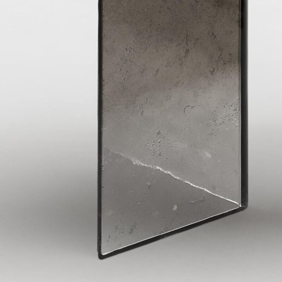 Top and legs in two layers of baked glass with irregular edges. All decorated in degradé from lead grey to transparent, with partial silvering on the back.