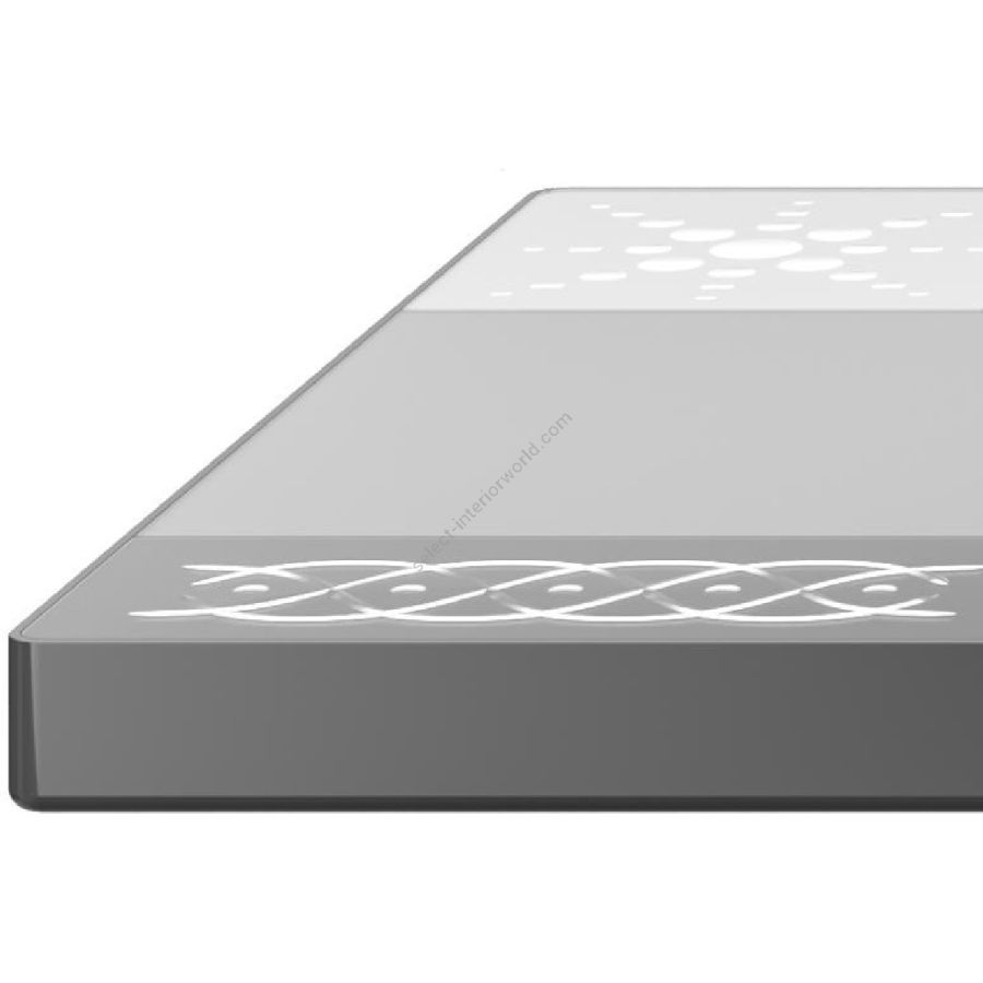 Shiny London grey lacquered plywood structure. Top with extraclear acid etched 6 mm thick glass varnished in multicolour and decorated with silver hand engraving.