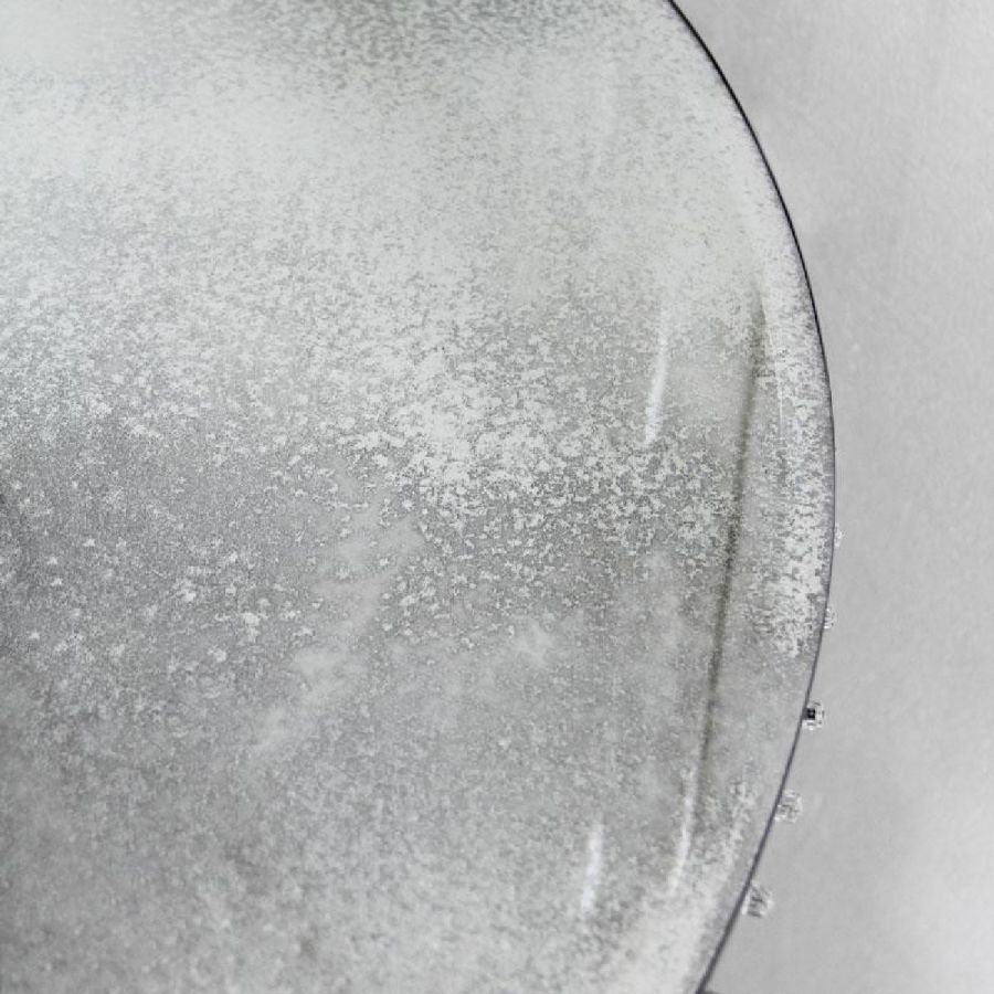 Round top made of bevelled glass with medium antique mirrored finish. Frames and legs made of bevelled and engraved glass tiles with medium antique mirrored finish.