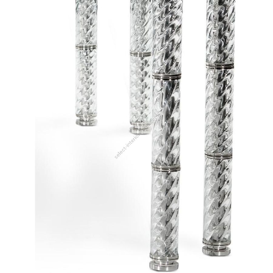 Table in shiny black lacquered wood with details in chromed brass. Top in black Marquina marble and black glass with silvered engravings. Legs in crystal colour torchon glass.