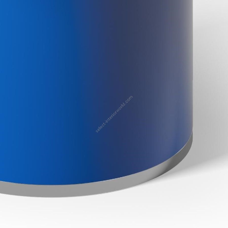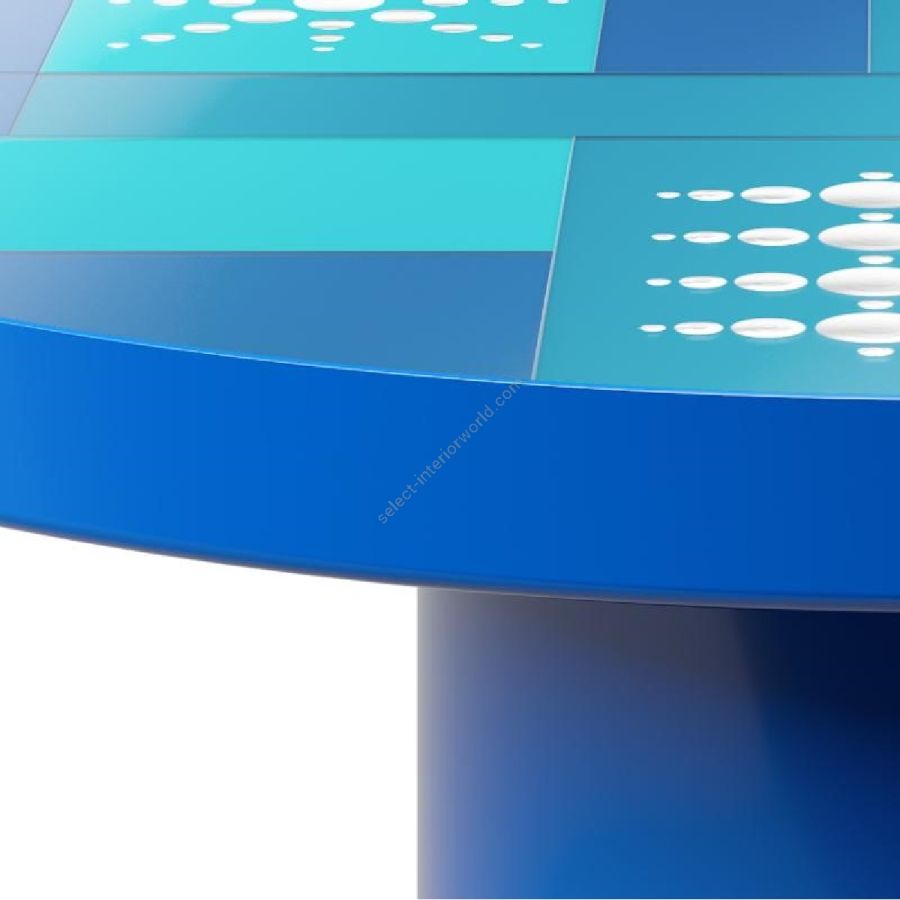 Shiny deep blue lacquered plywood structure. Top with extra-clear acid etched 6 mm thick glass varnished in multicolour and decorated with silver hand engravings.