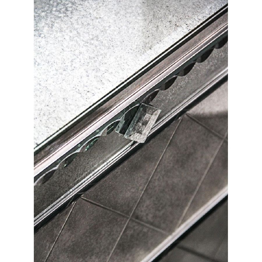 Top made of medium antique mirrored glass. Drawers, frames and sides made of engraved glass with medium antique mirrored finish and with thumbnail-shaped etchings.