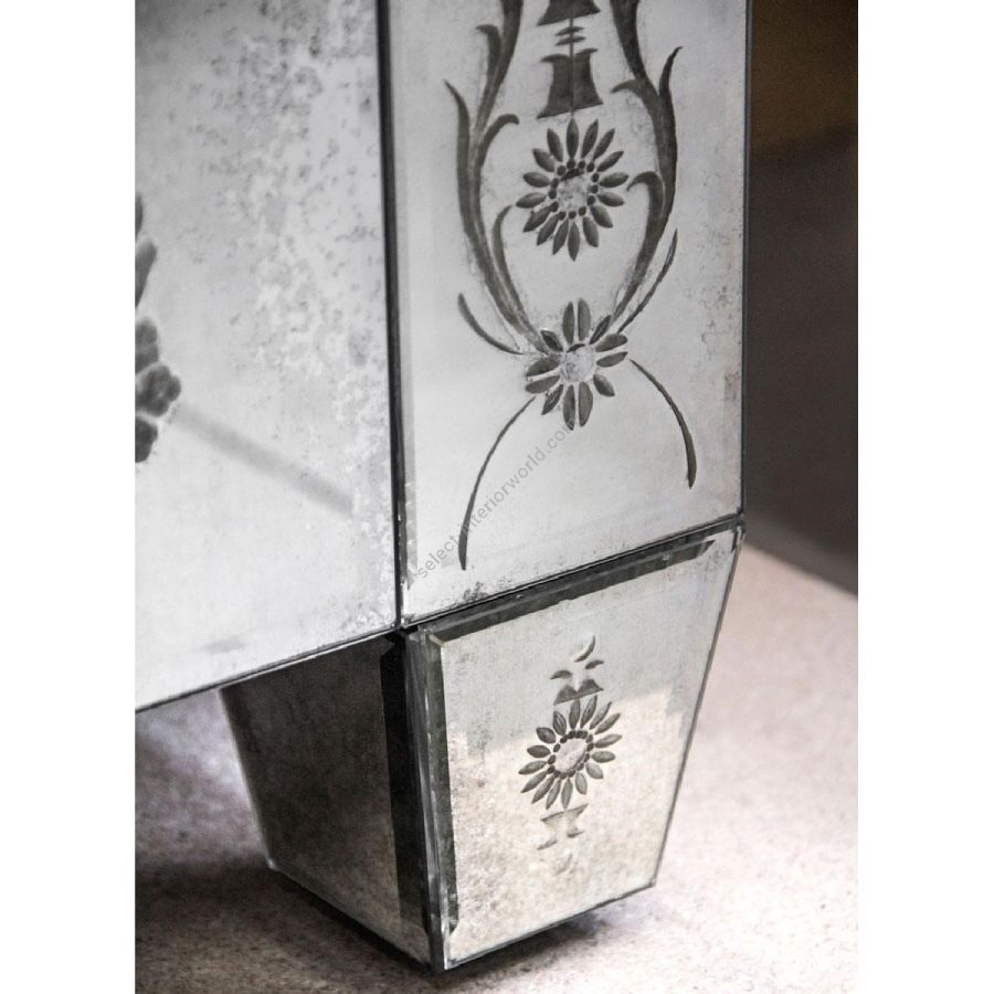 Top and back made of medium antique mirrored glass. Frames, doors, sides and legs made of bevelled and engraved glass with medium antique mirrored finish.
