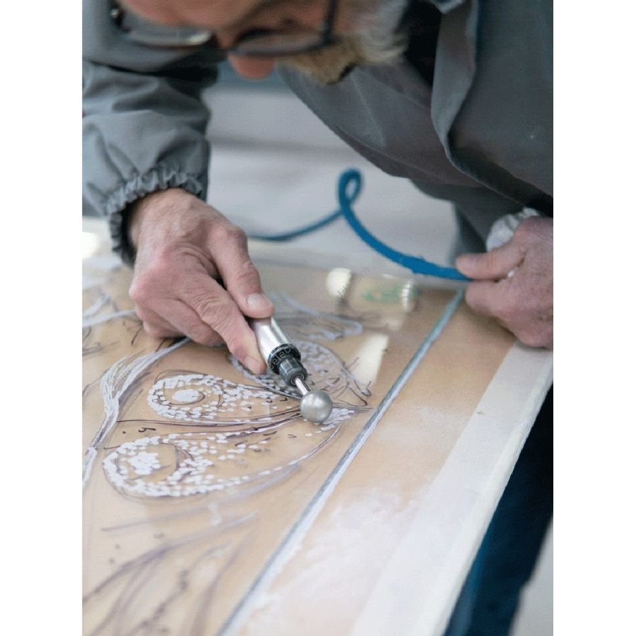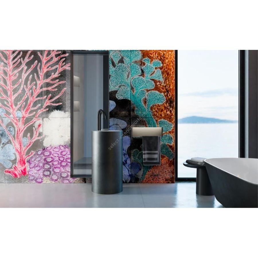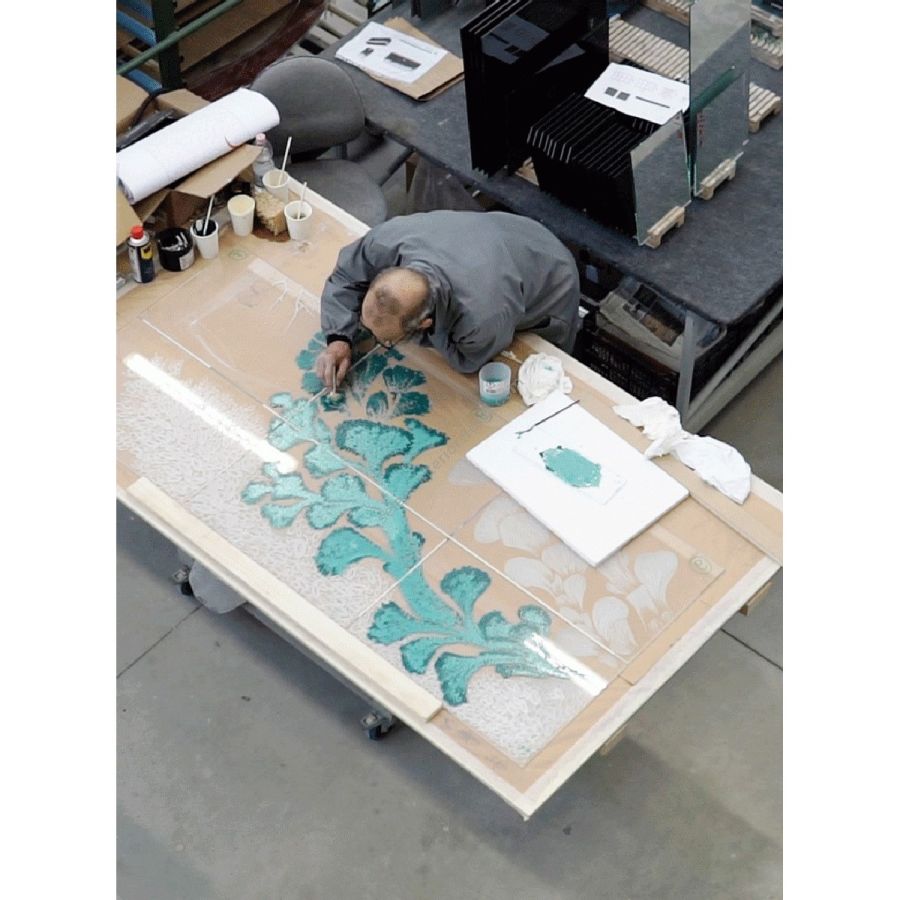 The protagonist of Posidonia is a seabed made with a pen engraving technique with a diamond ball. Algae, corals and anemones are then painted and shaded by hand, while the effect of the ocean depth is obtained by silvering the wall by hand with rare craftsmanship. Each glass panel is pen etched both on the surface and on the back, it is then hand painted and only in the final stage it is silvered with a heavy antique finish.