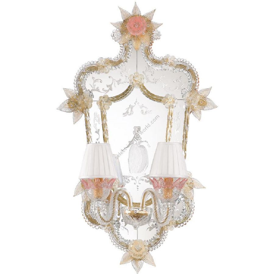Floral motif and the depiction of the Venetian Countess Querini engravings. Decorative leaves, curls, rosettes and twisted ropes made of crystal and gold coloured Murano glass.