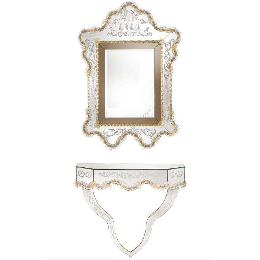 The most famous characters are the typical engraved curl finishings together with the depiction of Bacco, Justice or the well-know Venetian Eighteenth-century. Crystal colored Murano decorative flowers, leaves, twisted ropes and multicoloured glass paste rosettes embellish each Venetian mirror. The result is a unique item comparable to a work of art for craftsmanship and excellence in its execution.