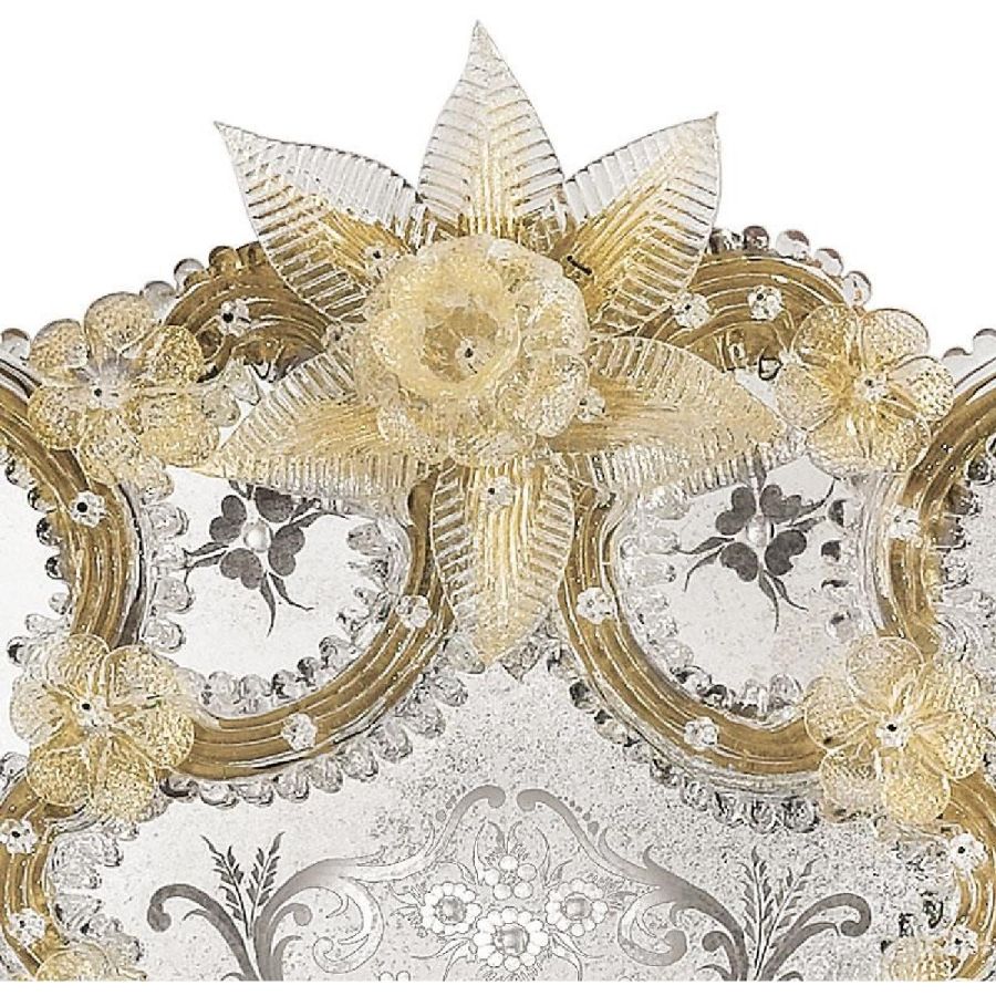 The most famous characters are the typical engraved curl finishings together with the depiction of Bacco, Justice or the well-know Venetian Eighteenth-century. Crystal colored Murano decorative flowers, leaves, twisted ropes and multicoloured glass paste rosettes embellish each Venetian mirror. The result is a unique item comparable to a work of art for craftsmanship and excellence in its execution.