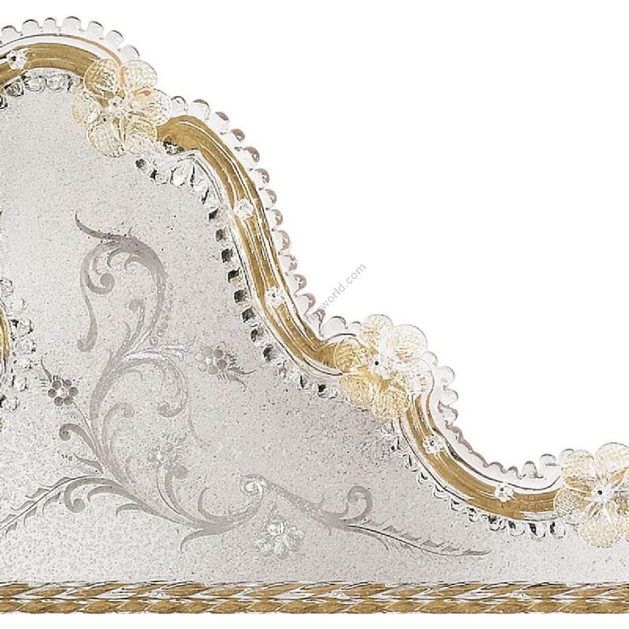 Floral and geometric motif engravings. Decorative leaves, curls, rosettes and twisted ropes made of crystal and gold coloured Murano glass.