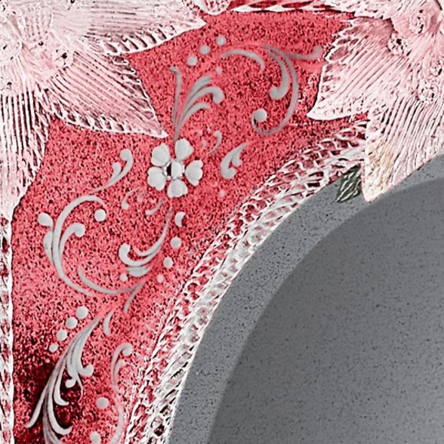 Structure made of fir wood with antique black finish. Venetian engraved glass with strawberry red varnished and medium antiqued mirrored finish.