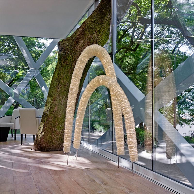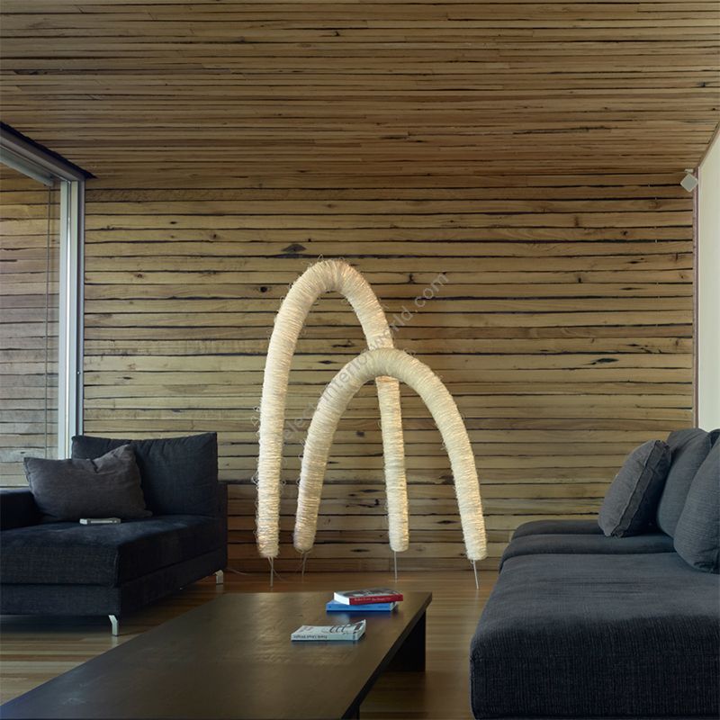 Inspired in the beautiful arches of Santiago de Compostela, this collection is a personal tribute to the ancient artisan masters of the city. The pieces are formed by two crossed arches that contrast their huge architectural volume with the smoothness of the Japanese cord that wraps them. The LED light that runs through them from side to side remains faded in a uniform and elegant way, generating authentic light sculptures.
