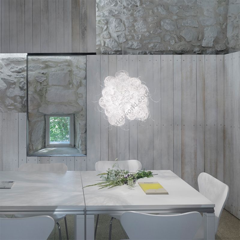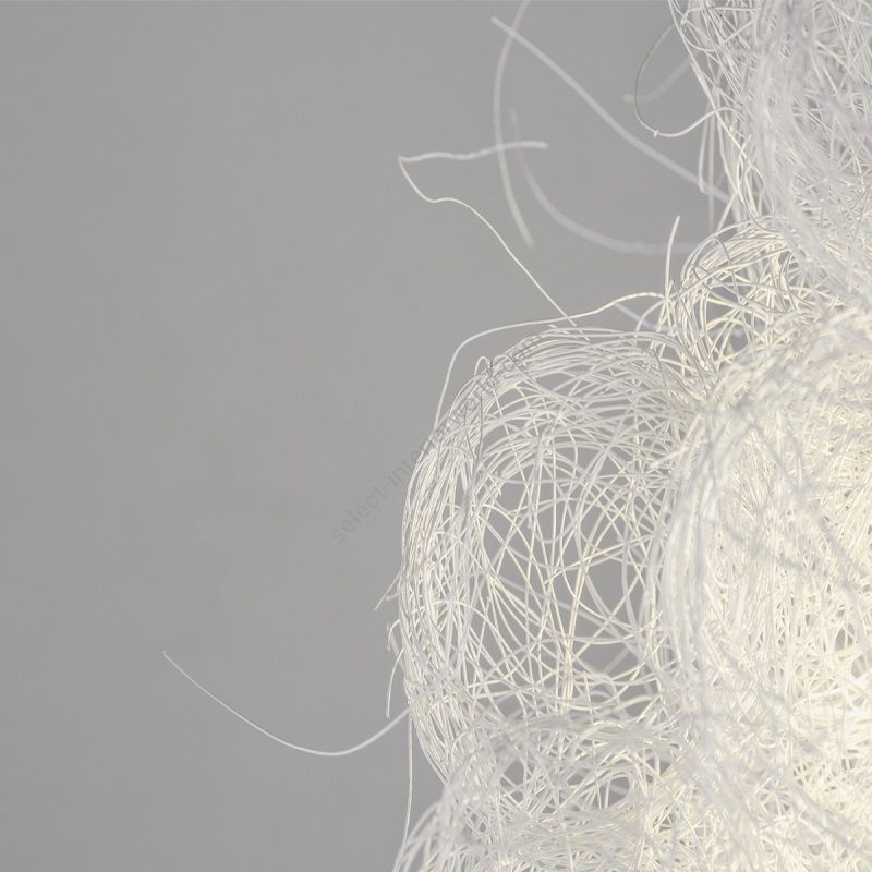 Arturo Álvarez introduces steel thread in his material repertoire with this collection. Embroiling it over and over again, he creates spheres that he later joins in ethereal, almost transparent, volumes; providing the design of a subtle beauty. Its white finish increases the delicacy of a piece generated from a cold material such as steel, that now seems to bloom full of life.