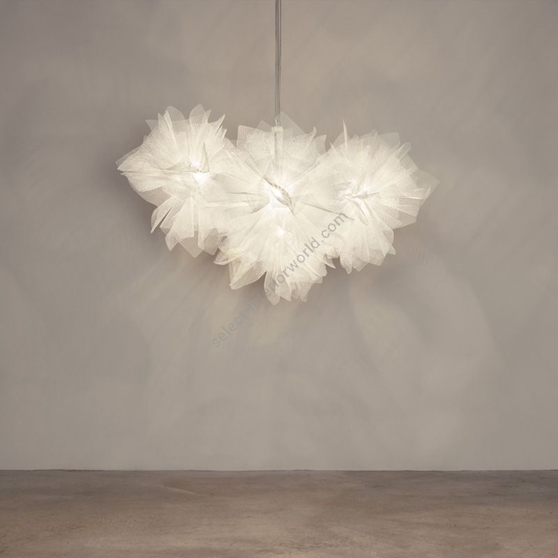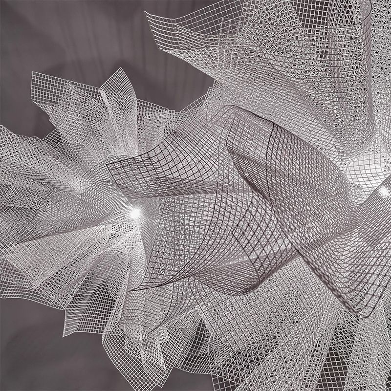 This collection of pendant lamps is created from galvanizaed painted steel mesh veils that gather gracefully around a single light point. A light form which reproduces the illusion of a filmy fabric, like a semitransparent tulle that reveals and hides at the same time, playing with the observers intuition. The lightness of this design, that achieved a Good Design Award in 2009, is enhanced in the largest chandeliers of the collection.