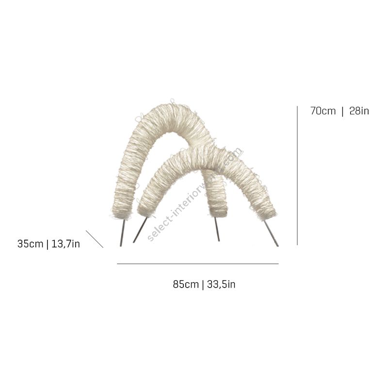 Inspired in the beautiful arches of Santiago de Compostela, this collection is a personal tribute to the ancient artisan masters of the city. The pieces are formed by two crossed arches that contrast their huge architectural volume with the smoothness of the Japanese cord that wraps them. The LED light that runs through them from side to side remains faded in a uniform and elegant way, generating authentic light sculptures.