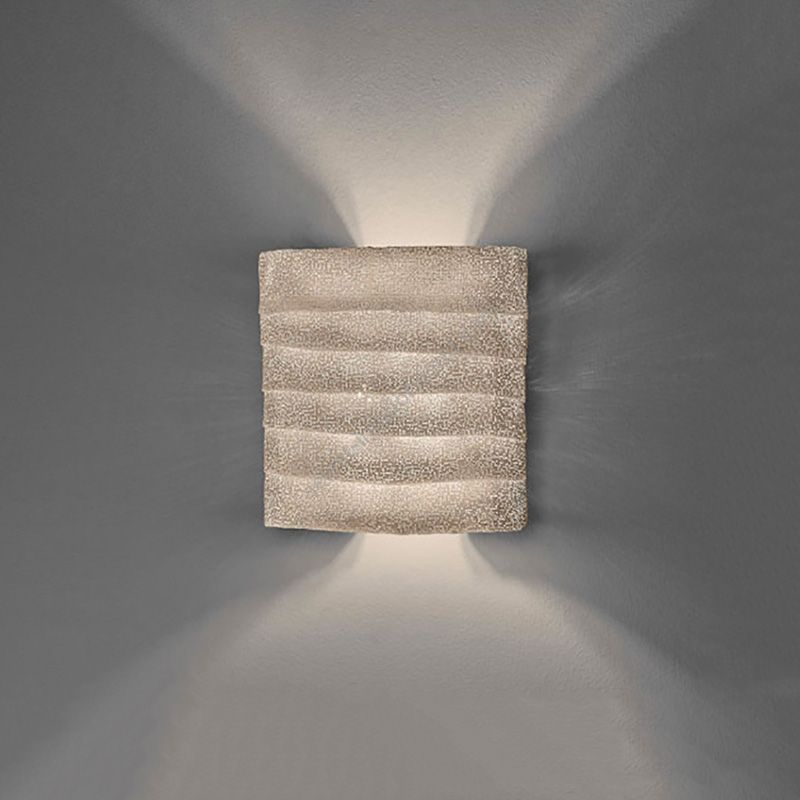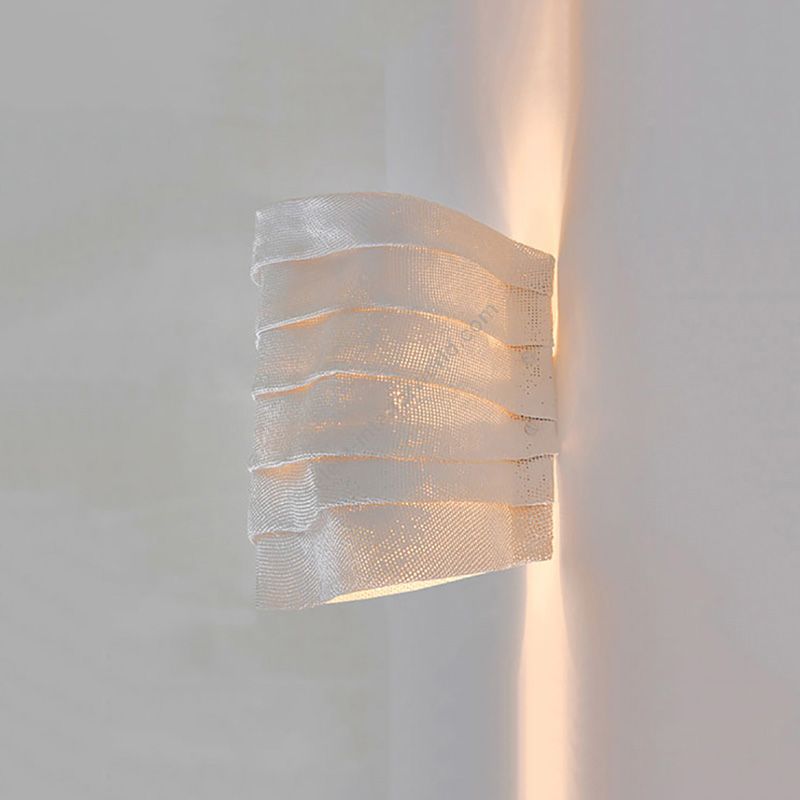 Kala is a delicate wall lamp handmade in painted stainless steel mesh. Its irregular volume, designed by Arturo Álvarez, recalls the changing patterns of the sand in the great dunes, horizontal lines marked by the folds of a material that plays at covering the light, allowing it to reflect indirectly on the wall.