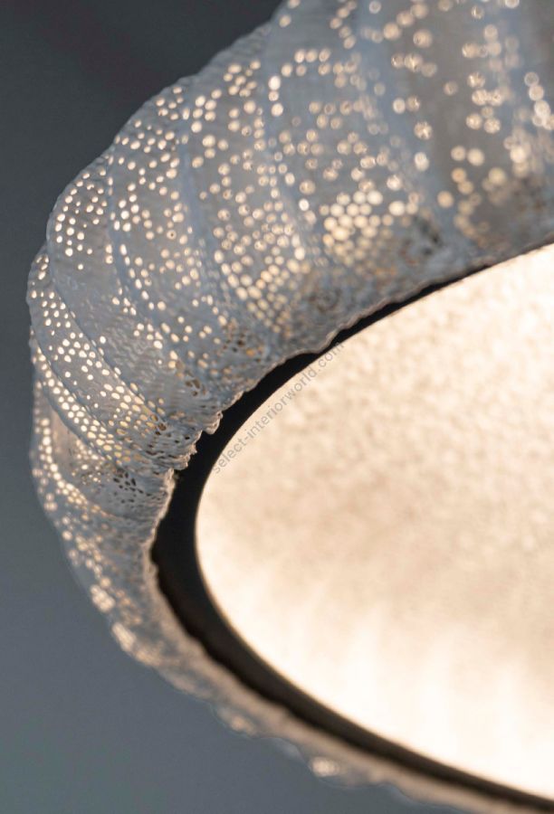 Beauty lies inside. Inn highlights the beauty within and illuminates it. It represents a whole evolution that starts from a circular base and ascends until it reaches the light, it is one of the icons of change and of our new stage as a-emotional light. The painted stainless steel mesh, our star material, is folded and collected in a customisable black capsule that houses the light. Inside, Inn holds a surprise: a black ring where all the folds connect. This design highlights the beauty of the interior, showing the folds and shapes that converge at one point.