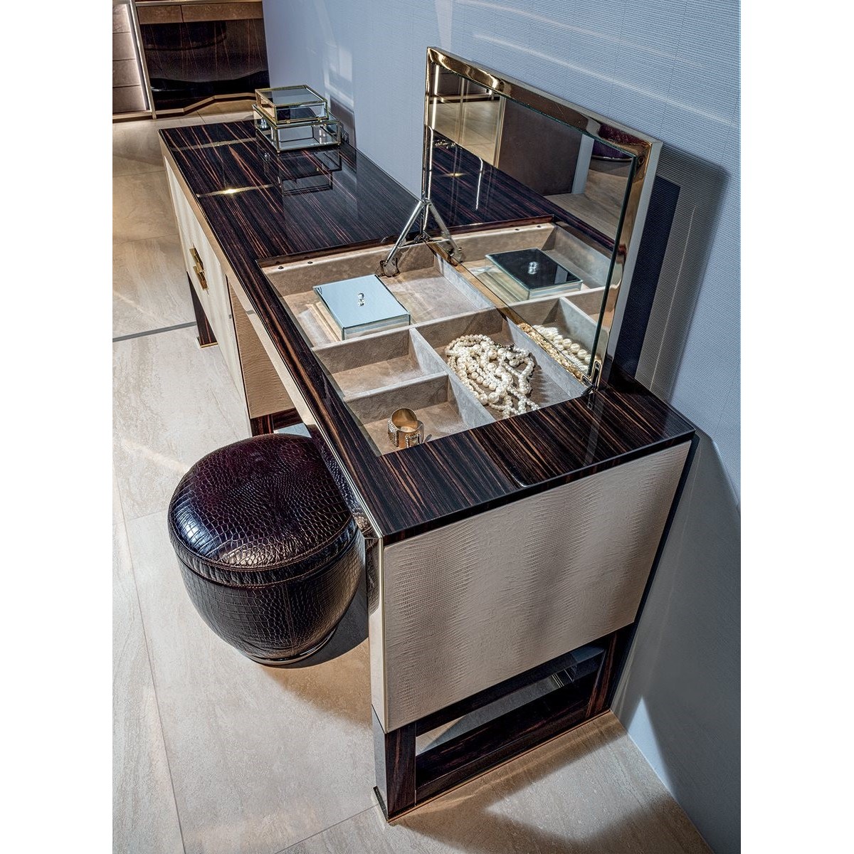 Make-up dresser with 2 drawers and functional storage area for cosmetics or jewellery. Base and top in wood finishes: glossy lacquered wood in range colours, glossy/matt ebony, glossy/matt Canaletto walnut, glossy/matt Sycamore frisè. Sides and drawer fronts upholstered in leathers from the catalogue. The interior of the cosmetic container is covered in P.3 Cat. Suede leather and the flap door closure is equipped with a mirror with metal edges.Ground metal base profile and frame in the following finishes: bright shaded brown, bright light gold, matt Champagne gold, bright chrome, bright black chrome, matt satin bronze, bright pink gold, matt pink gold, Black Rose gold. Handle with marble insert (marble from the range).