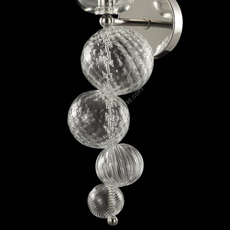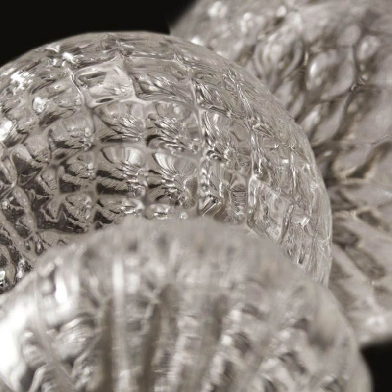 The source of light is positioned above the spheres, so that the light can pass through them and create beautiful glares on the glass surface. This is an elegant lighting work, made with high quality materials and refined techniques, but at the same time it is an ironic composition.