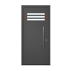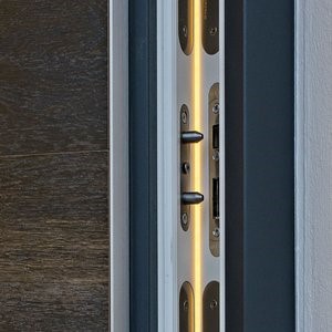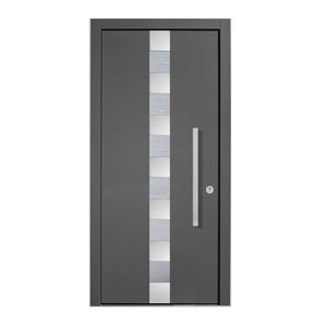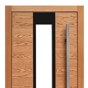 Entrance door with individual light cut-out framed by modules made of wood or stainless steel.