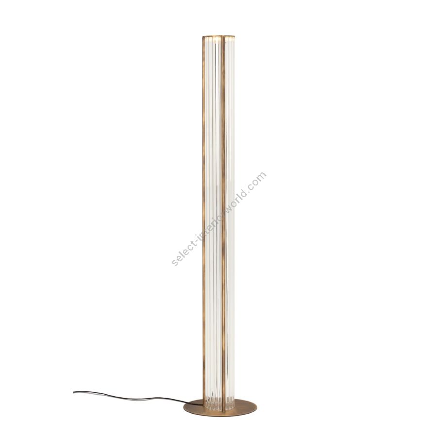 Totem II is 150cm tall. The shade is a transparent fluted borosilicate glass cylinder with a diameter of 12cm. The iron structure is made up of a base, an upper cover and three rods that link both along the glass. It comes in two finishes: textured black painted, and electrolytic bath in satin bronze. The light source is a TRIAC-dimmable 2700K 16W 1520lm LED module. It includes a switch/dimmer.