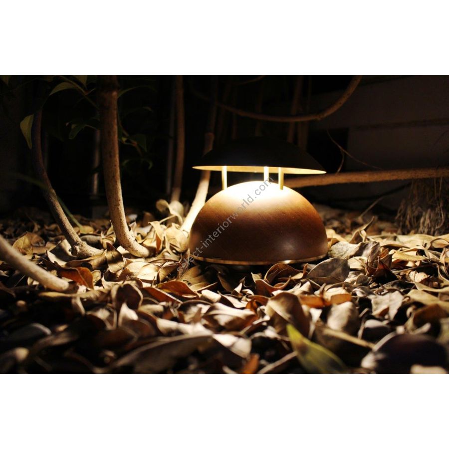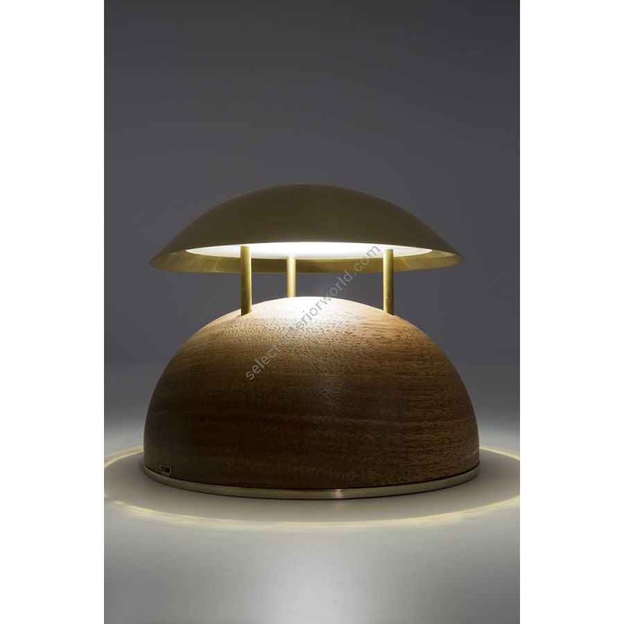 The BELL collection consists of a single model with a rounded base. It has an IP45 protection rating, which makes it optimal for under-roof outdoor use. The foot is made of solid wood from a tropical tree called Iroko, ideal for outdoors as it is hard, stable, invulnerable to insects and weather resistant. The shade is made of mat varnished polished brass, with a compact polypropylene lower diffuser. The light source is an integrated LED 1.3W 150lm 2700K CRI>90, dimmable thanks to an 'on/off/touch dimmer' switch located on the base. Its lithium polymer battery is rechargeable via USB, takes about 5 hours to charge and offers an autonomy of about 8 hours. The USB charger is not included, but ALMA Light can supply the chargers separately, in a single version to charge one lamp, or a multiple charger for several luminaires at the same time.