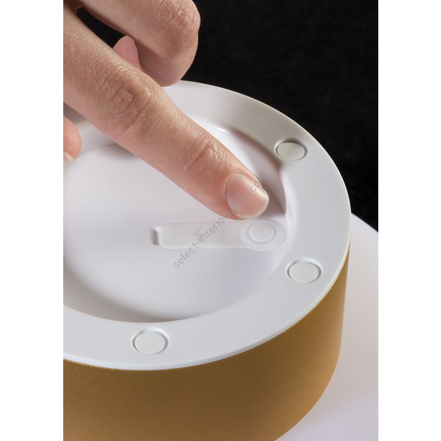 PATIO has two versions: low (H.13cm & 20cm diam.shade), and high (H.16.5cm & 16cm diam.shade). It has two finishes, gold and silver. The shade is made of rotomolded polyethylene and has an anodized aluminum cover that prevents glare. Includes an integrated Citizen 5V 1.2A max.3W 290lm 3000K CRI>90 LED. It has a Li-Ion battery with a maximum autonomy of 8-10 hours and a full charge time of 6 hours, which is charged using a USB connector (charger not included). In addition, the base has silicone stops to prevent the lamp from sliding on support surface.