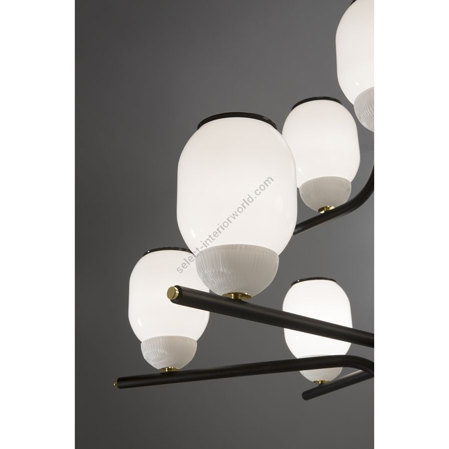 The shades of the THECHANDELIER collection are made of opal glass and can be smooth or grecale-style frosted. The structures are all made of electroplated iron in gloss polished brass finish, or textured painted white or black. The collection, however, is easily customizable in finishes, both metal and glass, to adapt to all types of projects. Inside each shade there is an E27 socket, which will allow the end user to choose the bulbs that best suit their wishes in terms of light temperature, intensity and possibility of dimming.