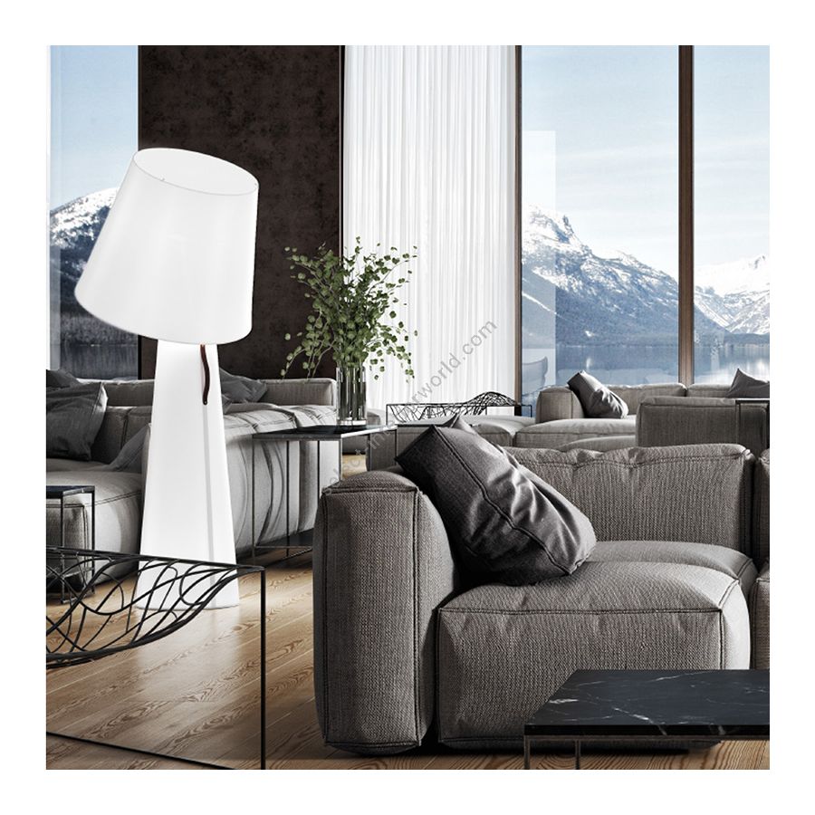 BIG BROTHER measures 180cm in height and the shade has a diameter of 70cm. It has a solid internal metallic structure that is covered with an advanced white translucent fabric of polyester fiber. There is, on demand, the possibility of selecting other fabrics, also printed. It incorporates light inside the upper shade, as well as in the base, both with E27 lamp holder.