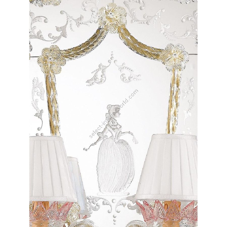 Floral motif and the depiction of the Venetian Countess Querini engravings. Decorative leaves, curls, rosettes and twisted ropes made of crystal and gold coloured Murano glass.