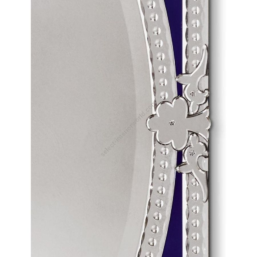 Central decor and corner tiles made of blue silvered varnished glass. Perimeter glass frames with decorative bevelling, shiny sphere engravings and light antique mirror finish.