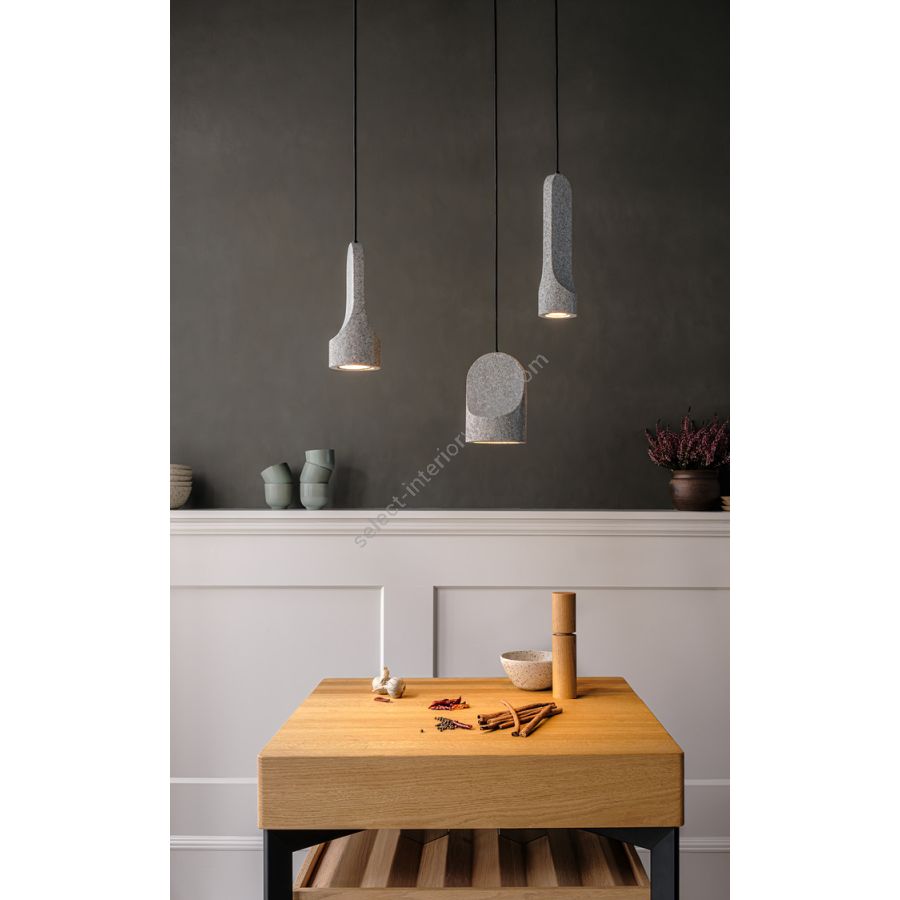 Stone and light, two opposing elements that Parga unites in the search for an almost fictional image. The energy contained within a mineral seeks to be released and radiate out in an intense beam of direct light. Parga is a collection that goes back to using granite for functional and decorative in indoor spaces, taking advantage of its neutral color palette and natural texture. This lamp is made from three pieces of different heights and diameters, each with a formal language reminiscent of the most primitive and rudimentary stone carvings. The material used is discarded pieces of granite mined from Galician quarries, making for a more sustainable use of materials. The granite forming Parga is compact, light gray in color and uniform with specks of black and fine grain.