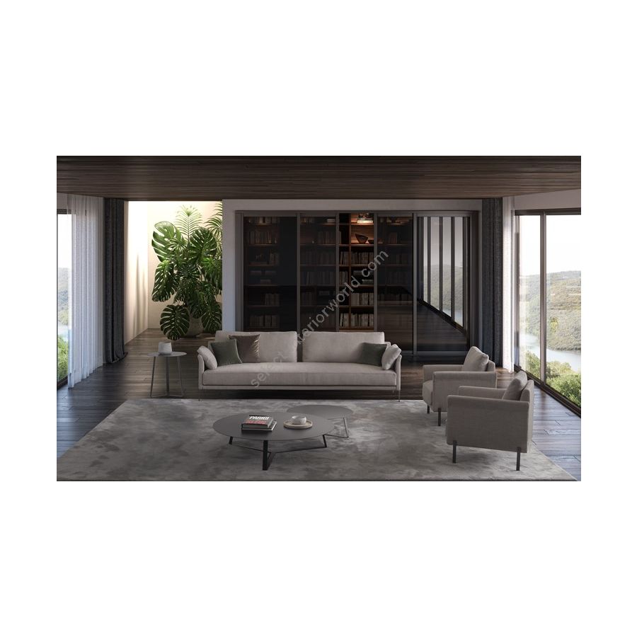 Babila consists of central and terminal elements, which come together sinuously to make even more new settings and combinations. It is characterized by a light air shell, lined with inviting cushions enhanced with hand made stitching, and by the choice of apparently slender but strongly structured foot.