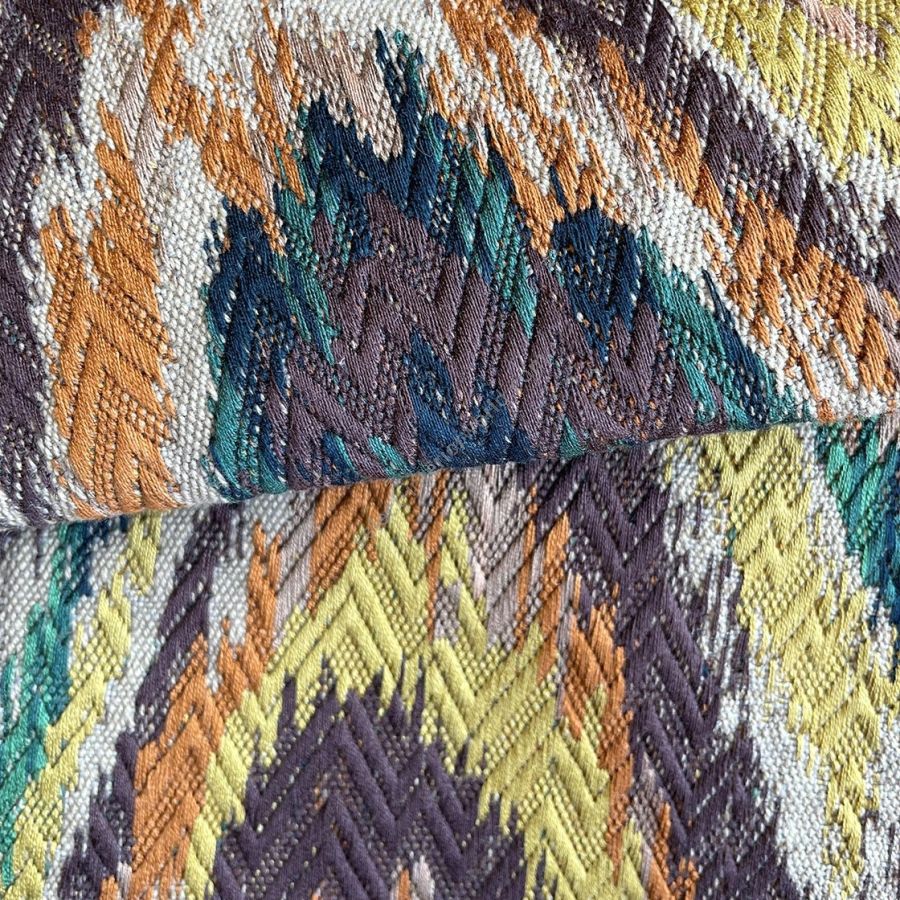 The vibrant Kyma Rio cushion has a striking flame stitch design and is backed in a bold shade of Capri silk velvet – Aquamarine. Available for immediate delivery.