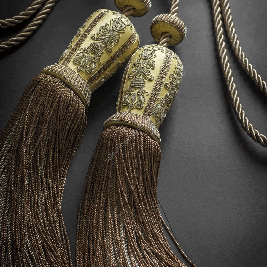 The delicately embroidered Mirabelle tieback depicts intricate columns of scrolls and leaves on the main body, with a generous fringe in metallic threads.