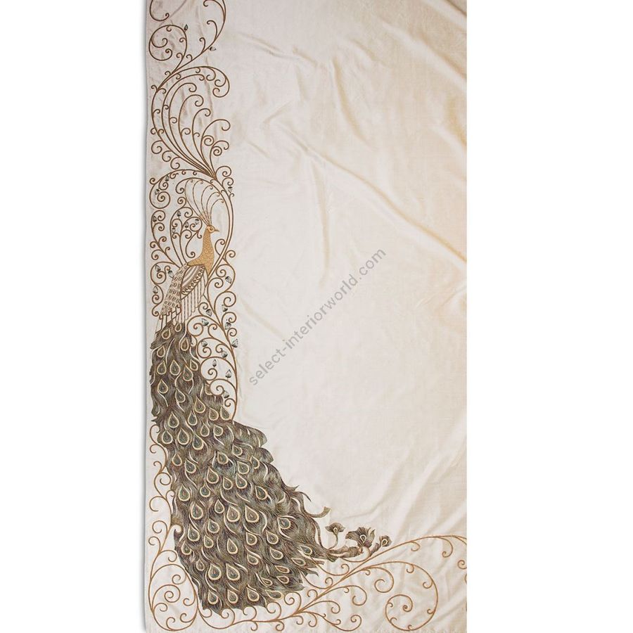 Juno is a marvellously dramatic panel combining the exotic plumage of peacocks with a beautifully worked scrolling design in gold thread.