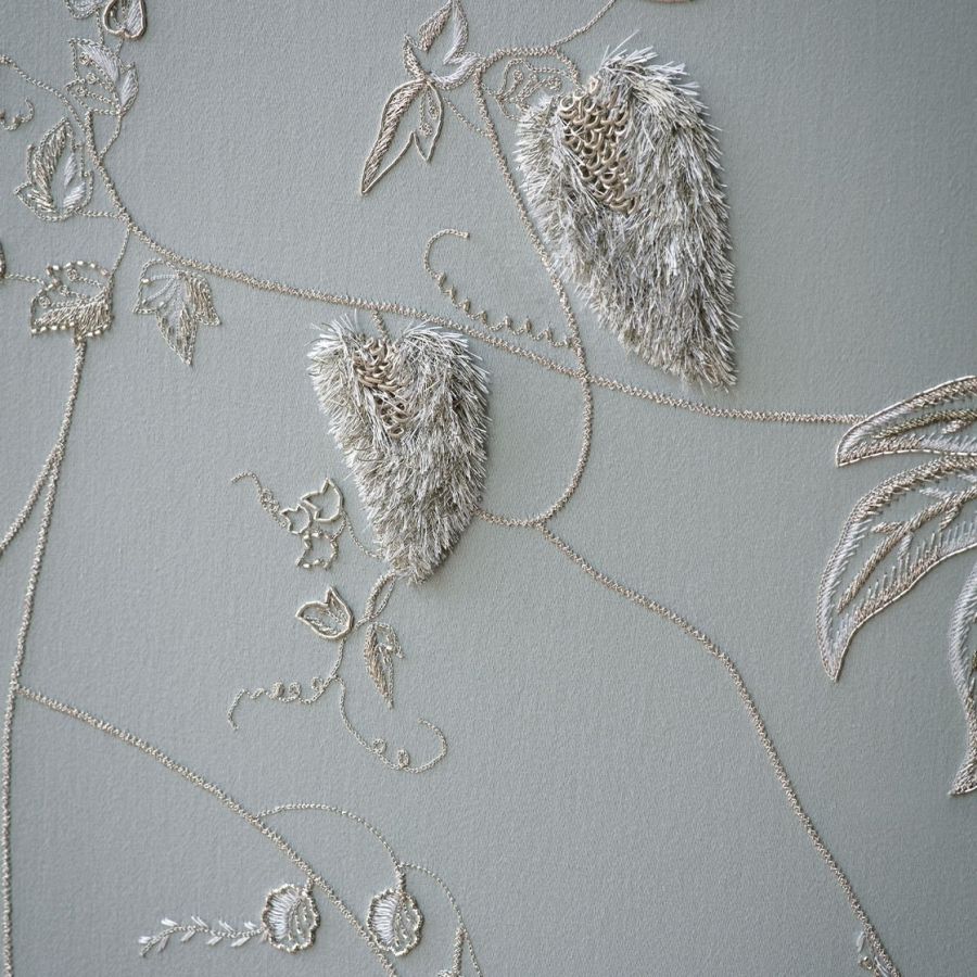 This interesting embroidery design, with its unusual thread work and delicate beading, creates a charming piece of art with an assuasive quality.