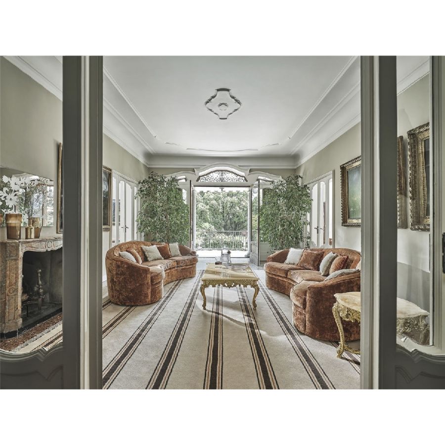 The sofas that dominate the living room area feature soft, curvy lines and are upholstered in luxurious velvet, creating an inviting and elegant atmosphere. This three-seat sofa is made from non-deformable foam polyurethane of varying densities, along with polyester fibre, ensuring long-lasting comfort and support. The wooden inside structure provides additional durability, while the fabric-covered feet complete the sophisticated look.