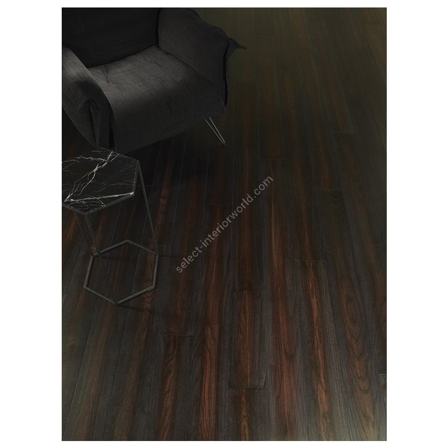 Among the Specials proposals created from Berti's collaboration with Diesel Living for the Diesel collection is the dark parquet Rrred. A wooden floor that is once again characterized by the alternating colour shades, including different colour fields. Here, the oak is dyed black and faded, and then it is dyed red, like denim, so as to highlight the transition from a warm shade of red-brown to a cold shade that turns grey on the width of each single wooden board. An exclusive aesthetic treatment that creates a three-dimensional shading effect and gives movement to the surface, detailing the environment with character and depth. In addition, there is a technical process in which the polishing of the parquet is carried out before the varnishing phase, so as to produce a wooden floor that is perfectly smooth and smooth to the touch.