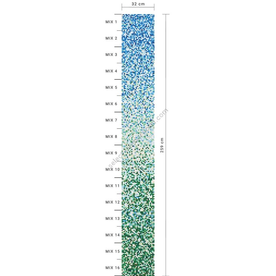 The edera shading blend is a sequence of mosaic blends arranged in a gradation from light to dark, made with 10x10 mm glass tiles. The shading blend is made up of 8 sheets, with two mixes per sheet (mix 1, mix 2, etc.), For a total of 16 mixes and an overall height of 259 cm. The individual mixes of the standard shading blends can be sold per sqm. This item is sold by the module. Module dimensions: 0.32x2.588 m (0.83 sq. m). For any customizations, click on “Request information”.