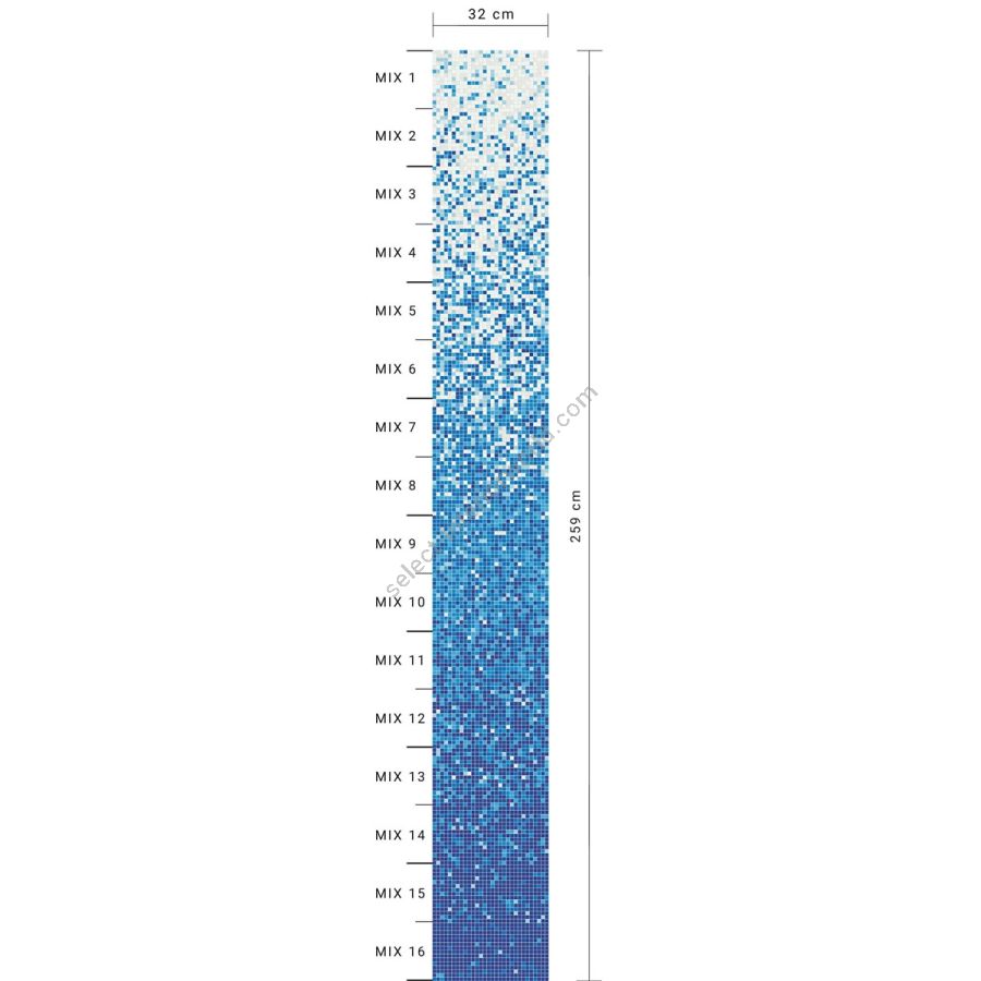 The new fiordaliso shading blend is a sequence of mosaic blends arranged in a gradation from light to dark, made with 10x10 mm glass tiles. The shading blend is made up of 8 sheets, with two mixes per sheet (mix 1, mix 2, etc.), For a total of 16 mixes and an overall height of 259 cm. The individual mixes of the standard shading blends can be sold per sqm. This item is sold by the module. Module dimensions: 0.32x2.588 m (0.83 sq. m). For any customizations, click on “Request information”.